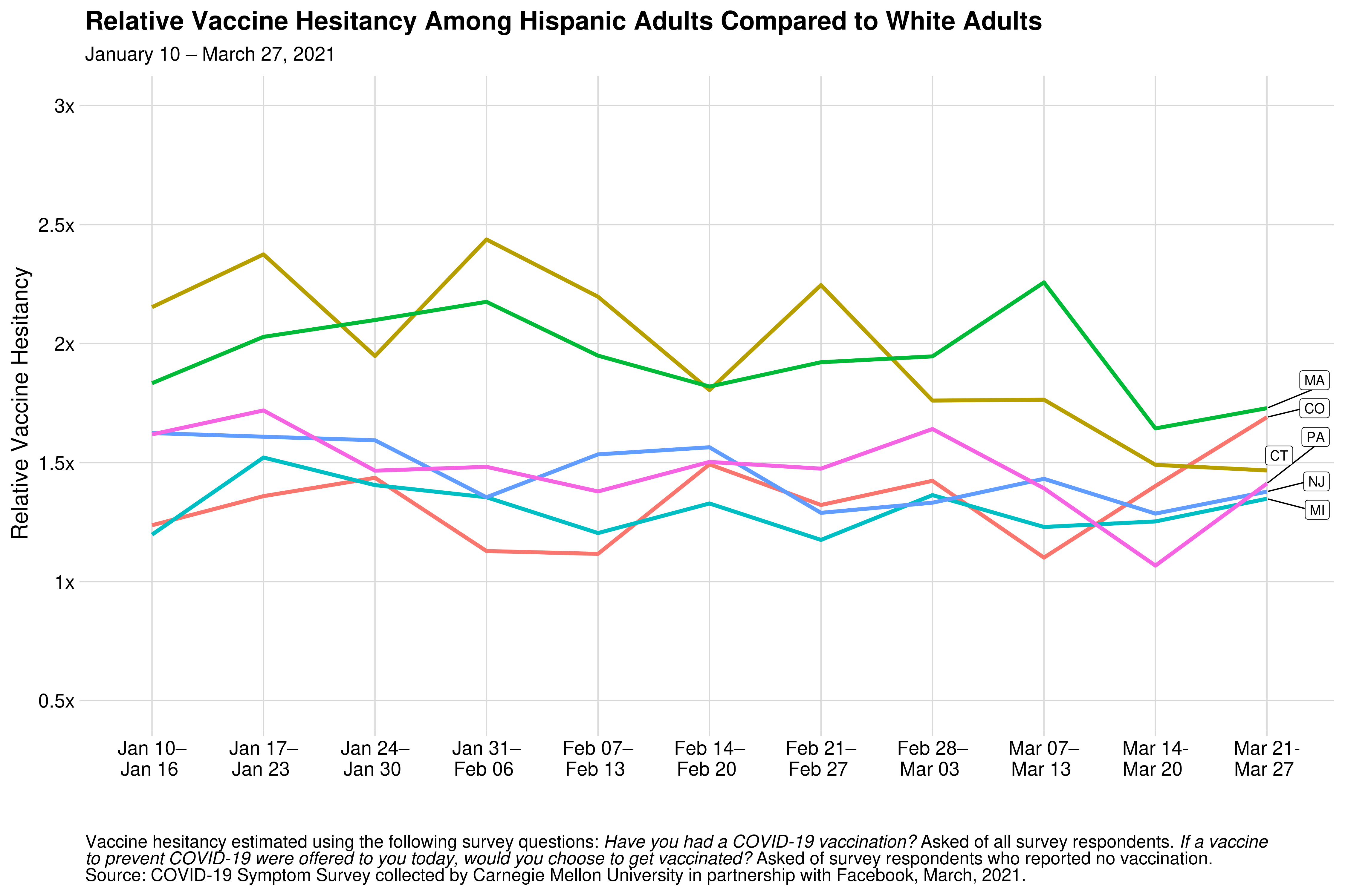 The large disparity in vaccine hesitancy observed in MA, CT, RI, PA, MI, and CO mirrors disparities in vaccine uptake. These states have one of the largest disparities in vaccination rates in the country (White-to-Hispanic vaccination rate ratios > 2.0 according to KFF), which suggests that addressing the disparity in hesitancy among unvaccinated adults may also help address the disparity in vaccine uptake between Hispanic and White adults.